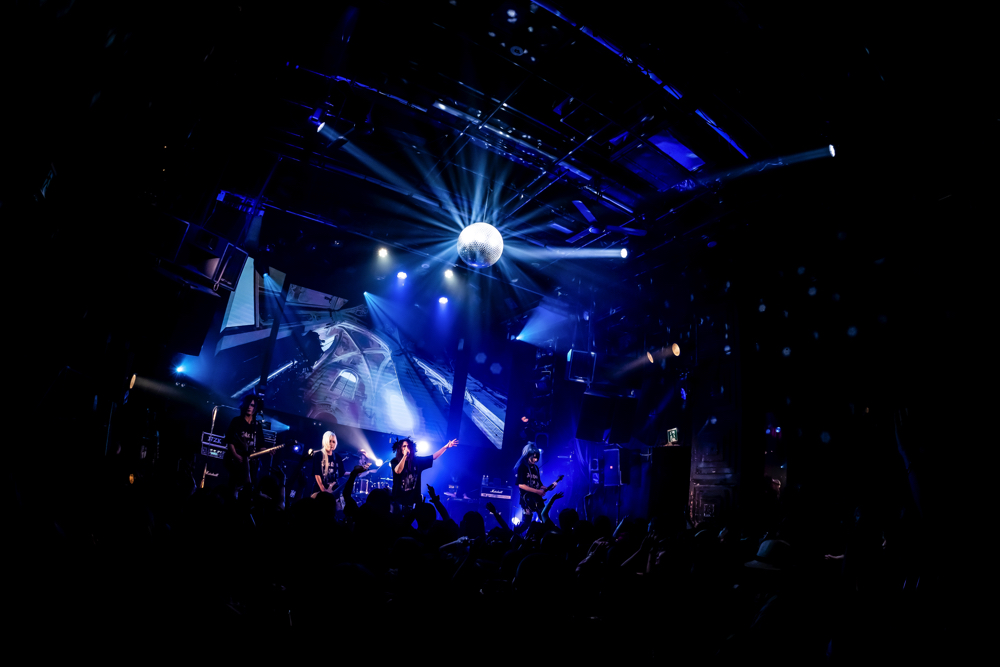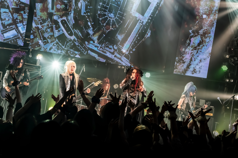 壮麗かつシンフォニックな音色が流れるのに合わせて、背景に古城の景色が次々と映し出される。Kakeruへ導かれた観客たちが、高く拳を突き上げる。「生きる証を見せつけろ、気持ちを空へ高く上げろ!」。Kakeruの言葉を合図に、『Alive』が始まった。高揚感を覚えるメロディアスかつエモーショナルな楽曲だ。演奏中、4人の生きざまを刻んだ歌へ共鳴するように、フロアには無数の手の花がずっと揺れ続けていた。激しい演奏の上へ美しいメロディーと旋律を重ねることで生まれる高揚感と興奮。だから気持ちが熱く昂り、高く掲げた両手を輝きを放つ彼らへ向けて捧げずにいれなかった。