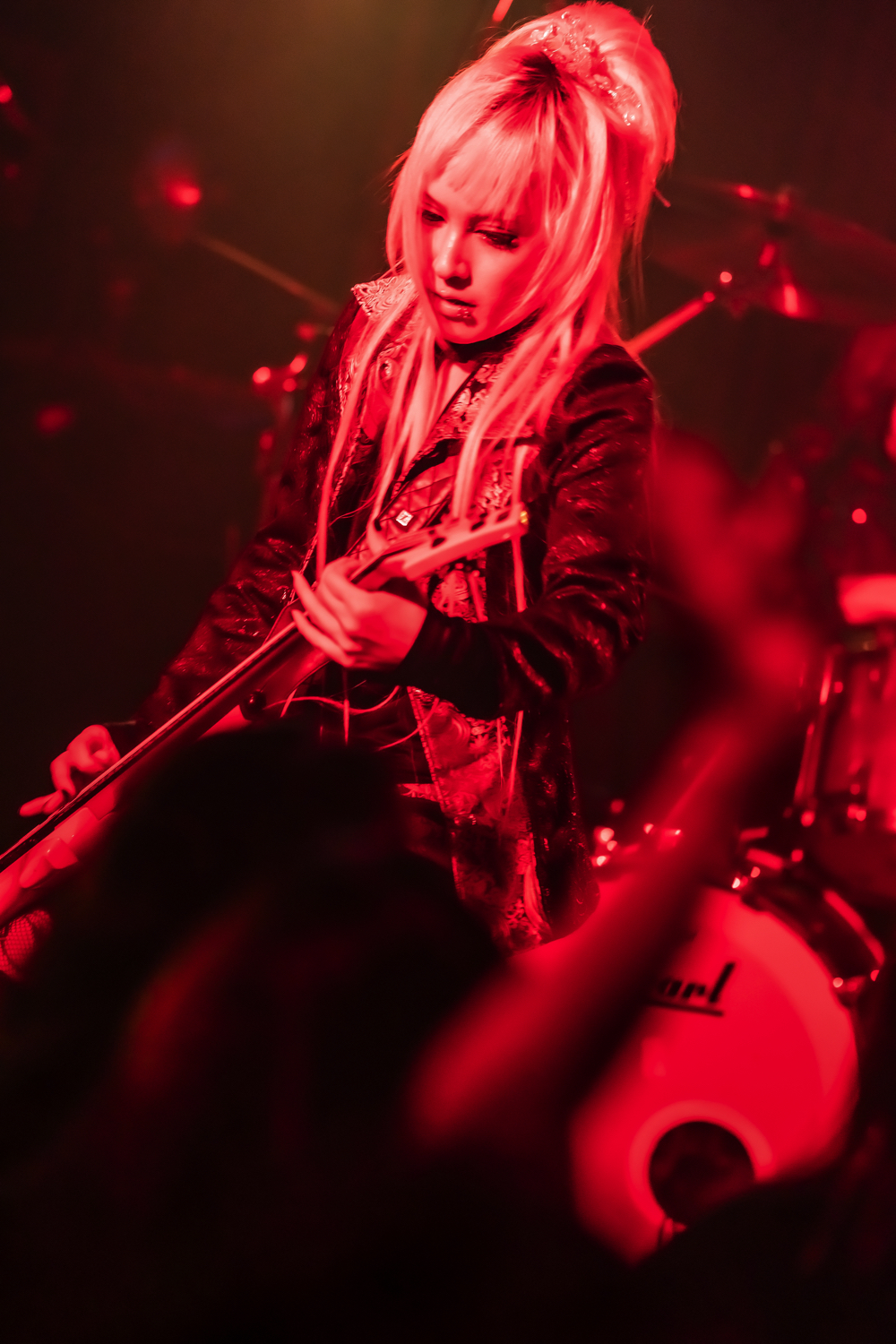 一気に場面を塗りかえるように,荘厳かつシンフォニック、感情を剥き出した攻撃的な演奏が炸裂。『Killing Me Softly』が始まったとたん、観客たちが激しく頭を振り乱し、フロアを右へ左へと跳ねながら移動してゆく。1曲の中、転調をするたびにいろんな攻撃的な表情を描きながら、彼らは観客たちの理性の螺子を狂わせてゆく。間奏では、Harukaと渚月が背中合わせでそれぞれにギターの旋律を交わし,ときに重ね合う姿も登場。さぁ観客たちよ、もっともっと人間を捨てて暴れ狂ってしまえ!