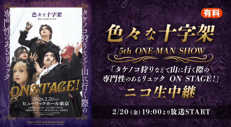 色々な十字架の記念すべき5周年ワンマンライブ「タケノコ狩りなどで山に行く際の専門性のあるリュック ON STAGE!」の完売を受け、ニコニコ生放送で独占ライブ中継が決定。2/20(金)19時~放送予定
