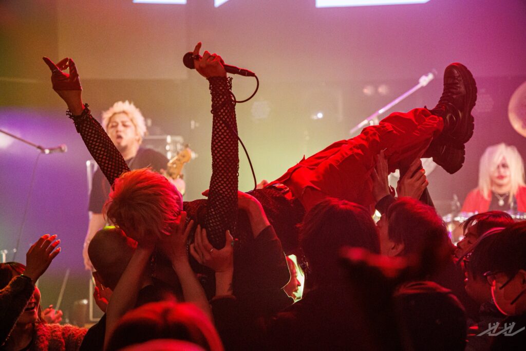 ギターソロではTomoがフロアにダイブし、観客たちがTomoを抱え上げてフロアをサーフしていく。